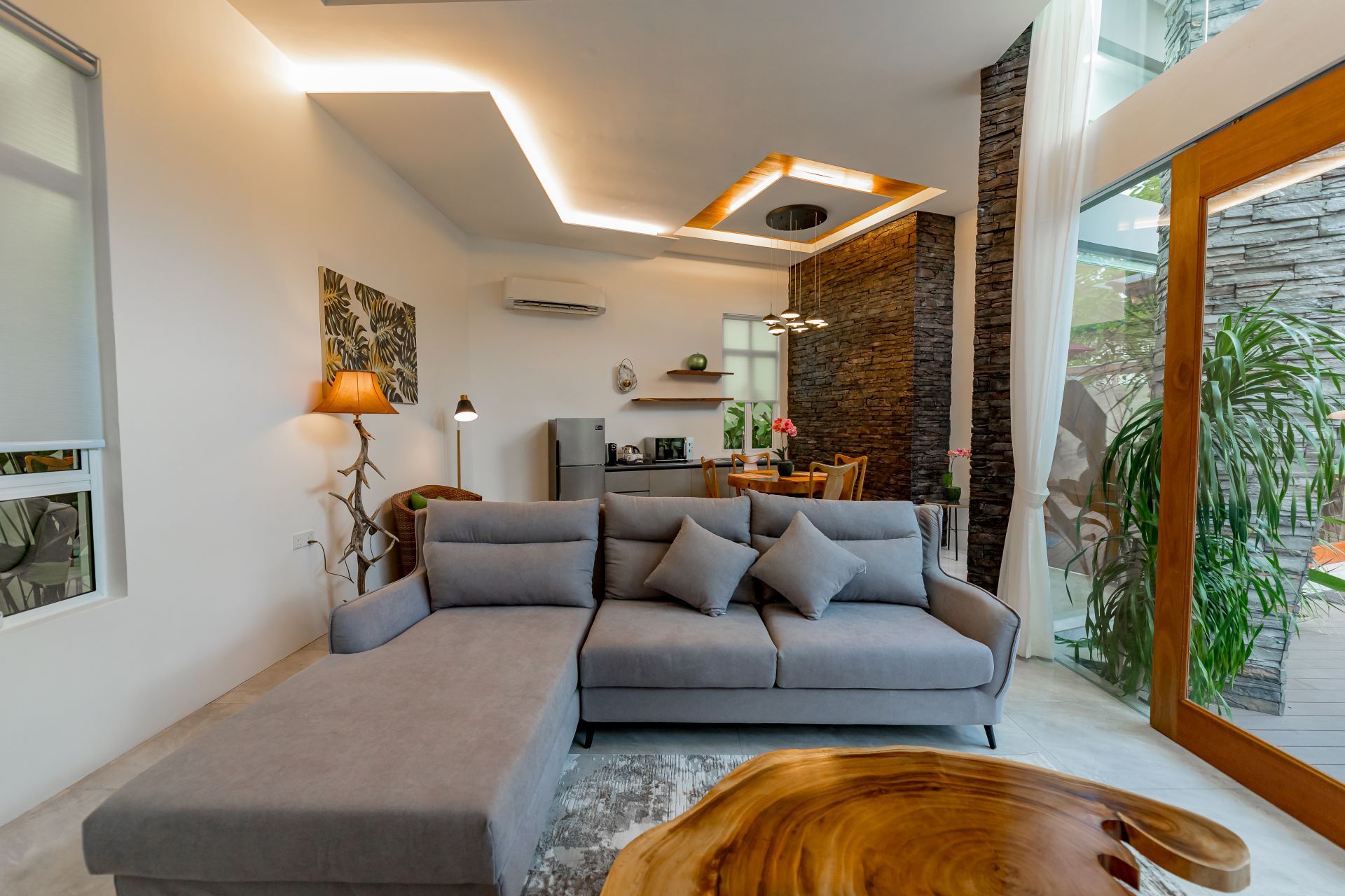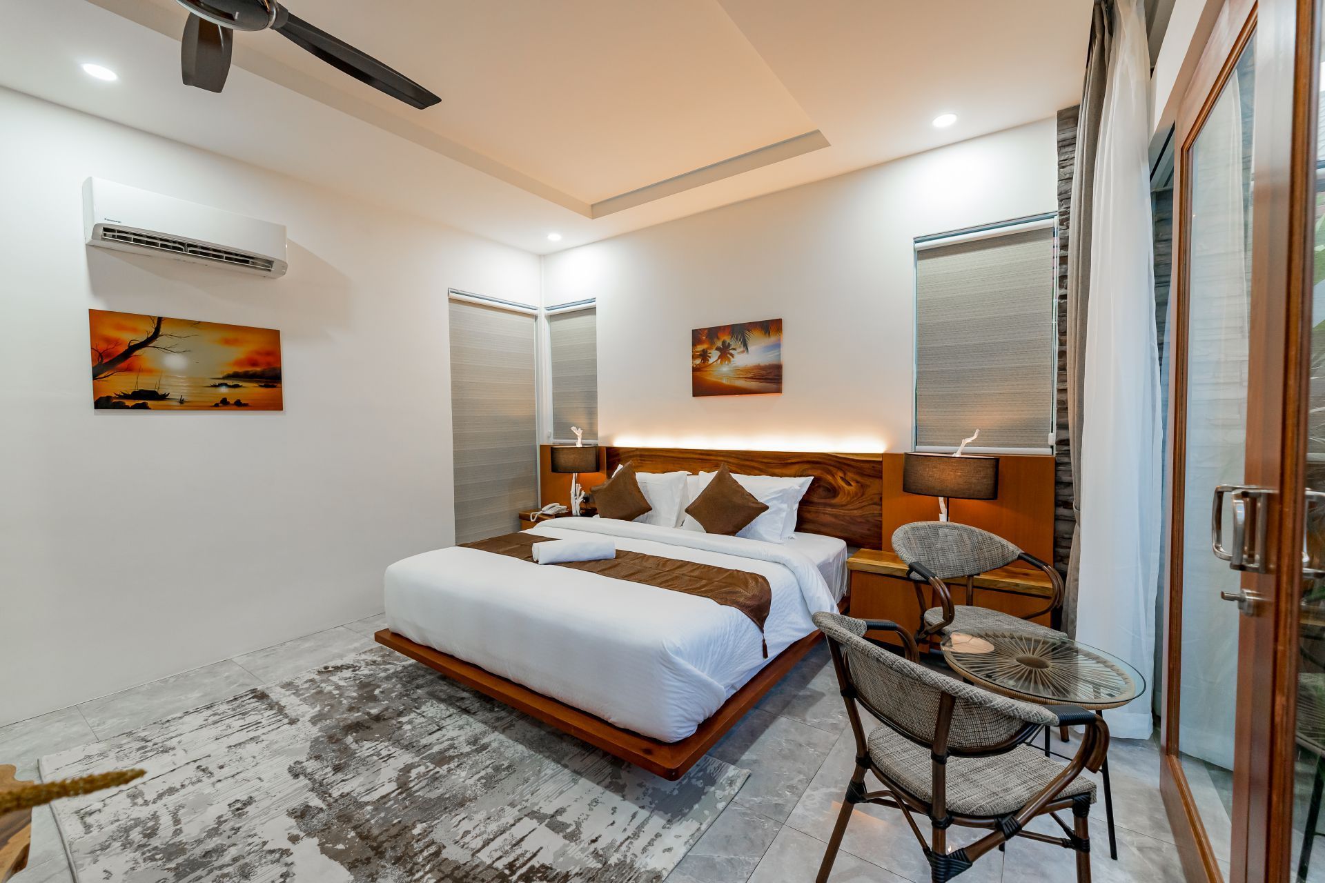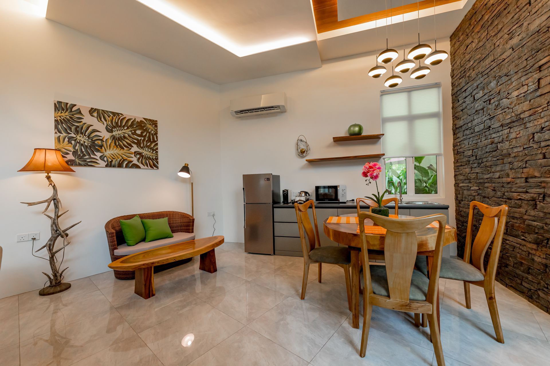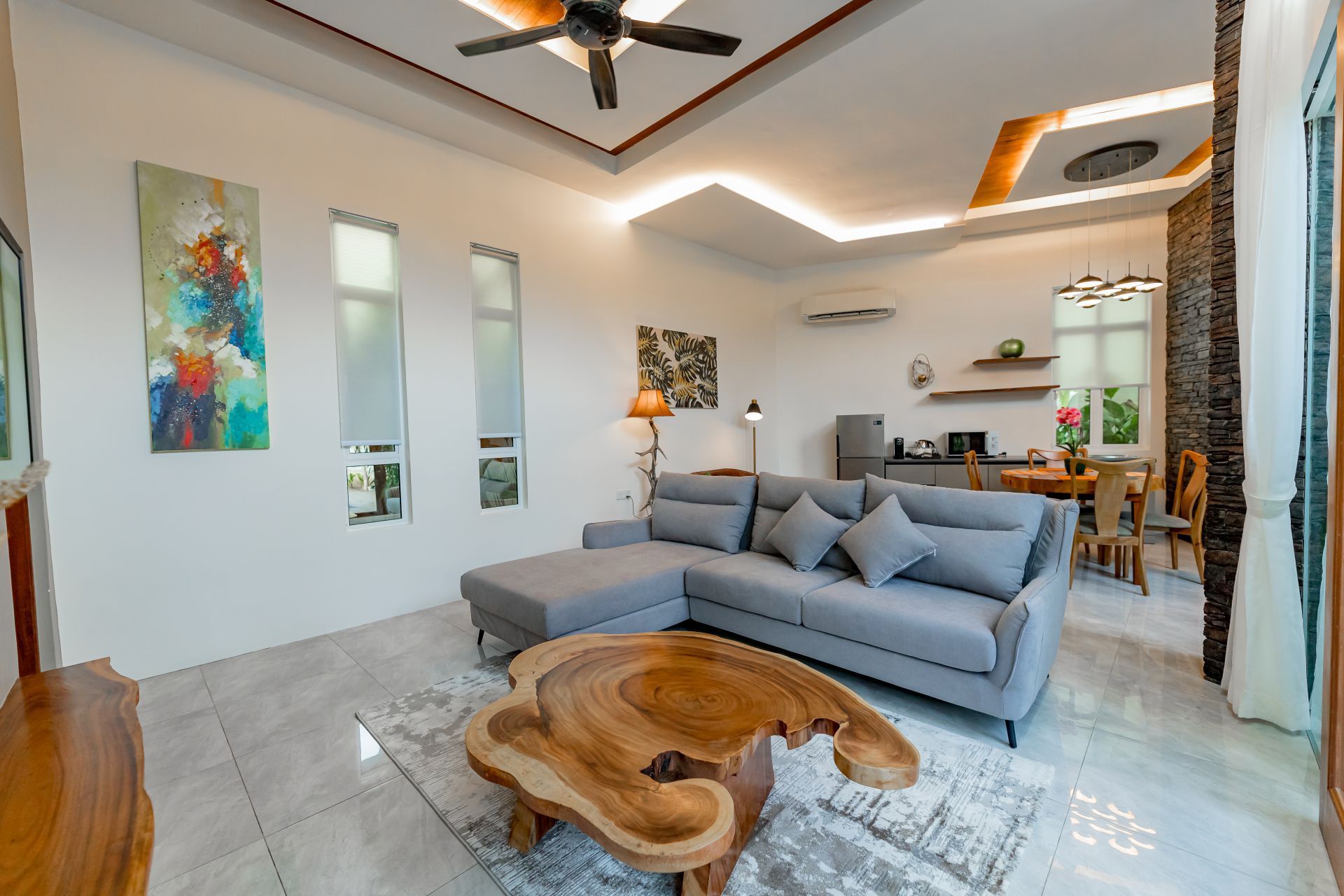 Our Deluxe Villa – 1 Bedroom Pool Villa offers the perfect blend of luxury and comfort for couples or small families. Our villa offers a private pool surrounded by comfortable sun loungers, chairs, and tables, allowing you to relax, sunbathe, and enjoy a refreshing dip in the pool. The fully furnished living room, dining room, and kitchenette ensure you have everything you need for a luxurious and comfortable stay.