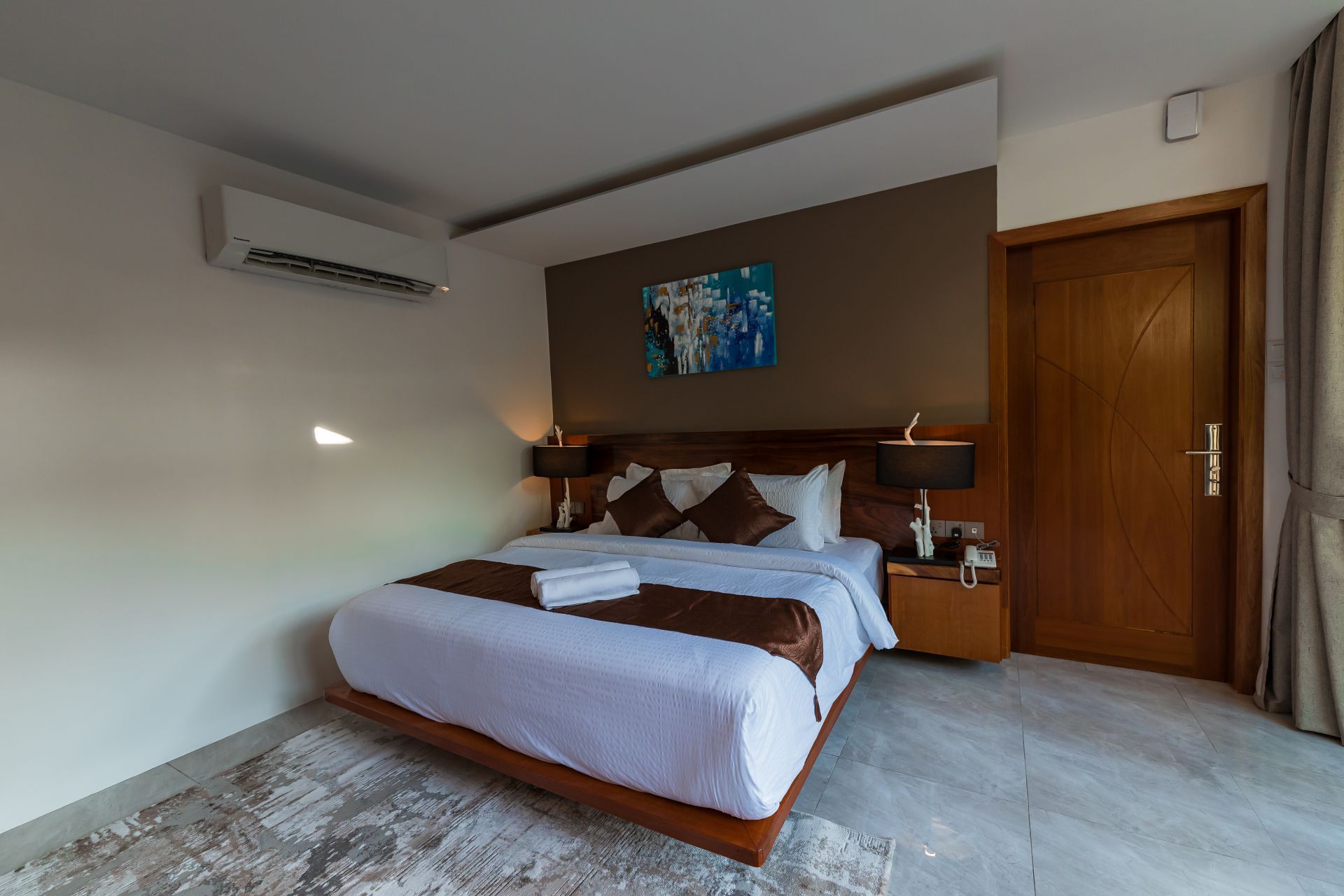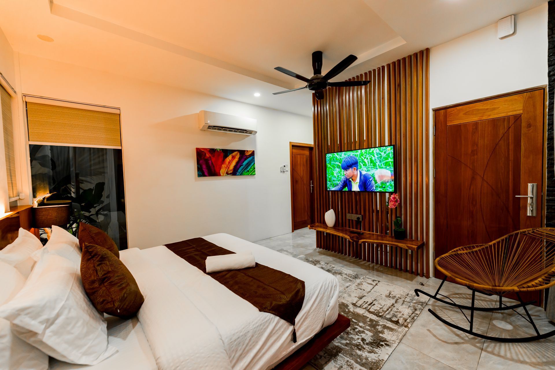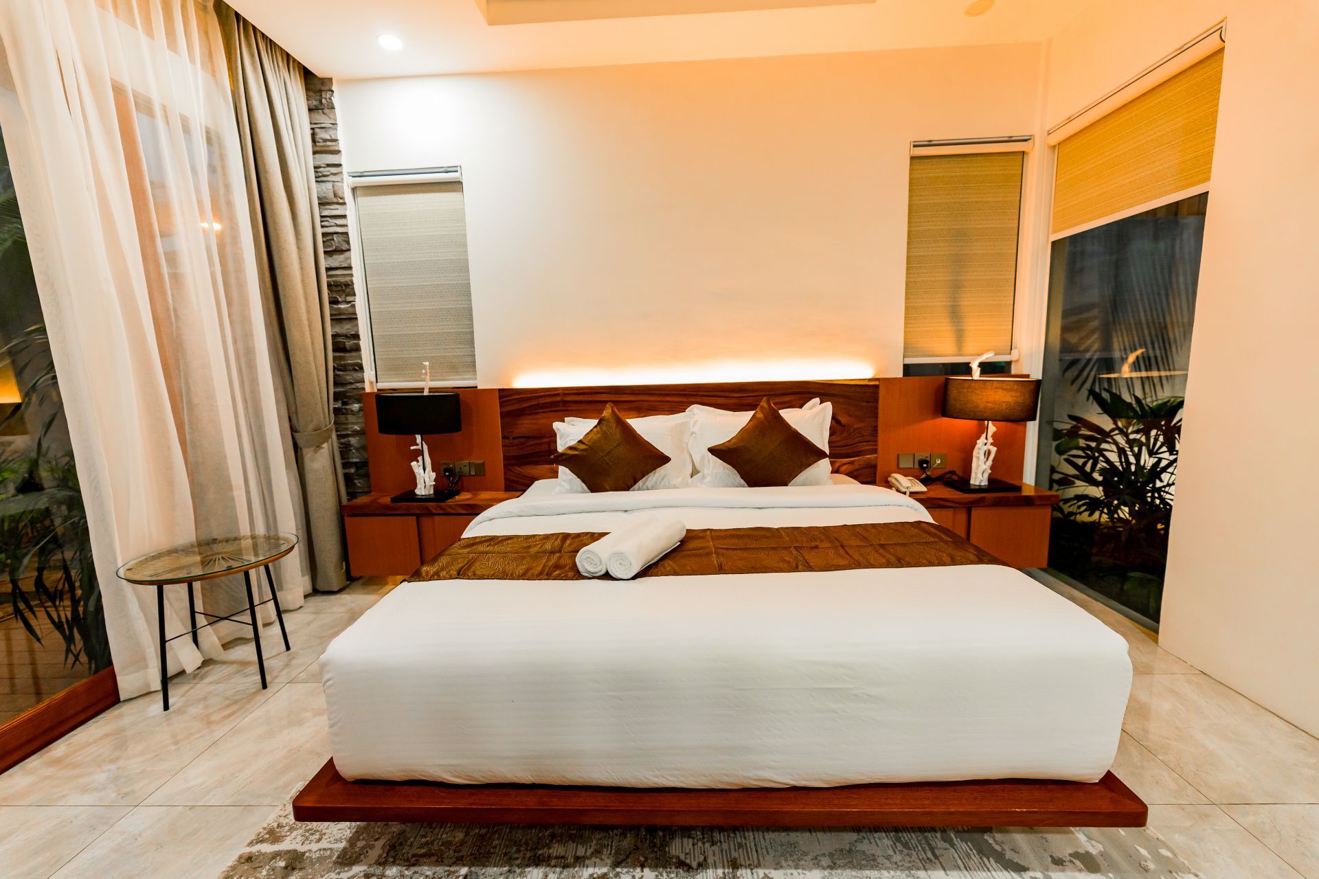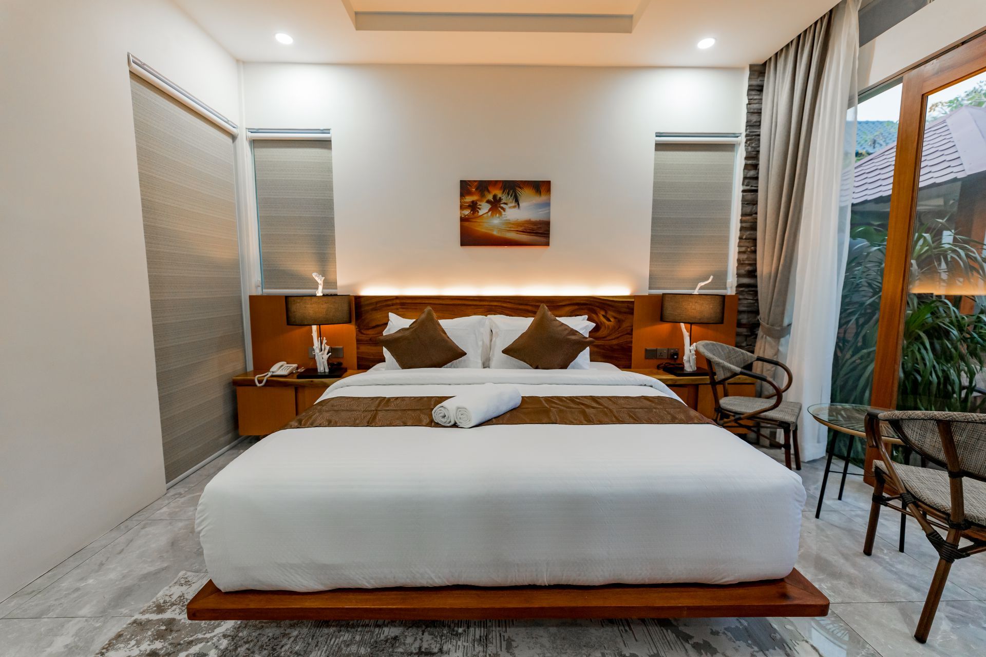Our Deluxe Villa – 1 Bedroom Pool Villa offers the perfect blend of luxury and comfort for couples or small families. Our villa offers a private pool surrounded by comfortable sun loungers, chairs, and tables, allowing you to relax, sunbathe, and enjoy a refreshing dip in the pool. The fully furnished living room, dining room, and kitchenette ensure you have everything you need for a luxurious and comfortable stay.