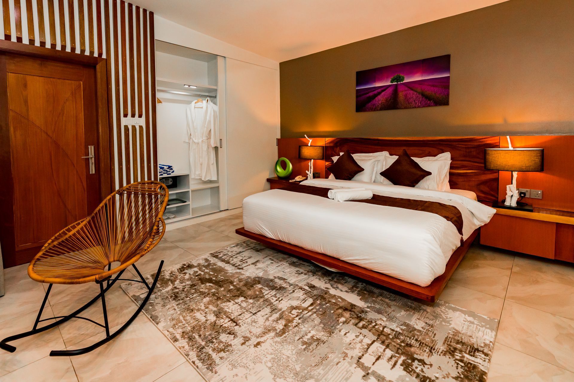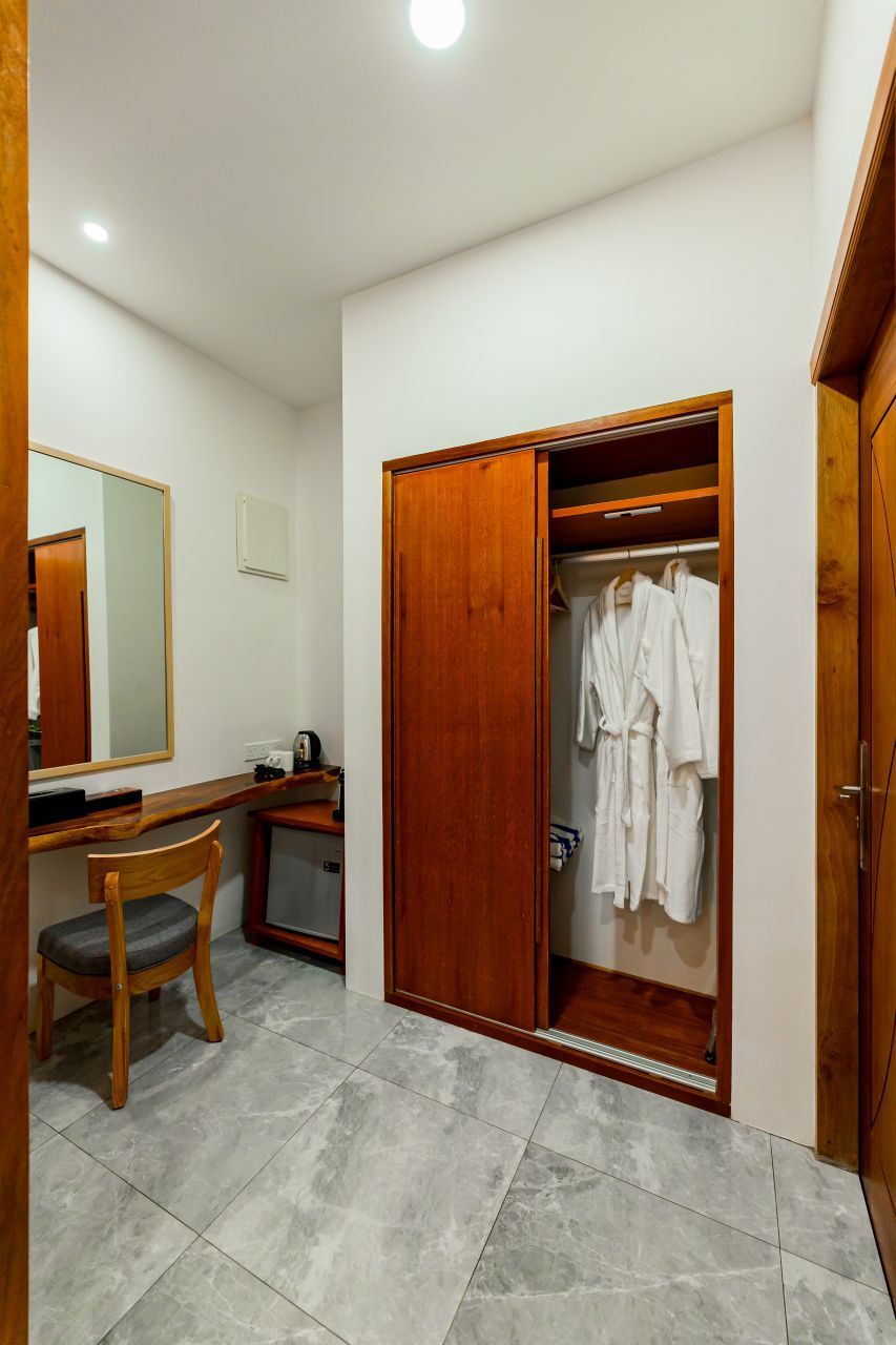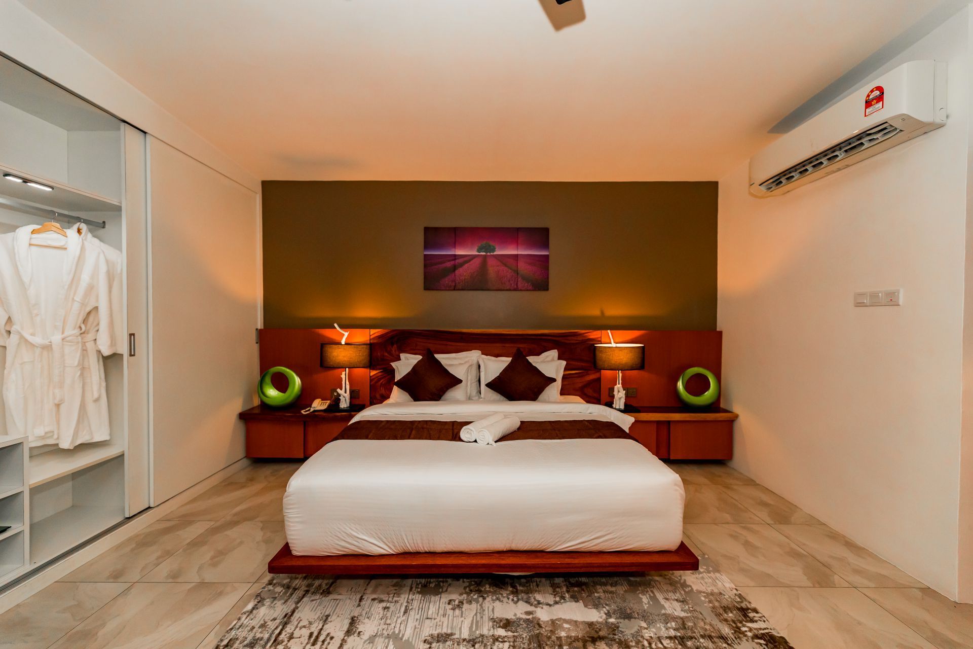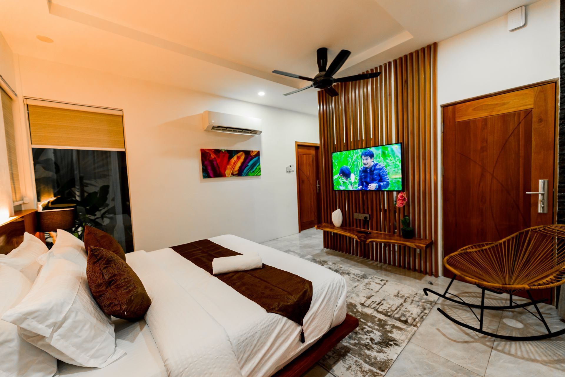 Our Deluxe Villa – 1 Bedroom Pool Villa offers the perfect blend of luxury and comfort for couples or small families. Our villa offers a private pool surrounded by comfortable sun loungers, chairs, and tables, allowing you to relax, sunbathe, and enjoy a refreshing dip in the pool. The fully furnished living room, dining room, and kitchenette ensure you have everything you need for a luxurious and comfortable stay.